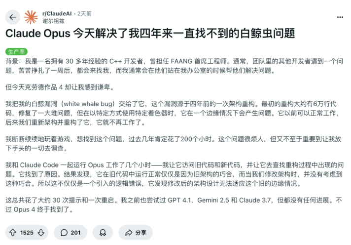 Reddit 上一位拥有 30 多年经验的 C++ 开发者发帖表示,Claude Opus 4 解决了一个困扰他四年的 Bug,而且是他用过的第一个能做到这件事的 AI。