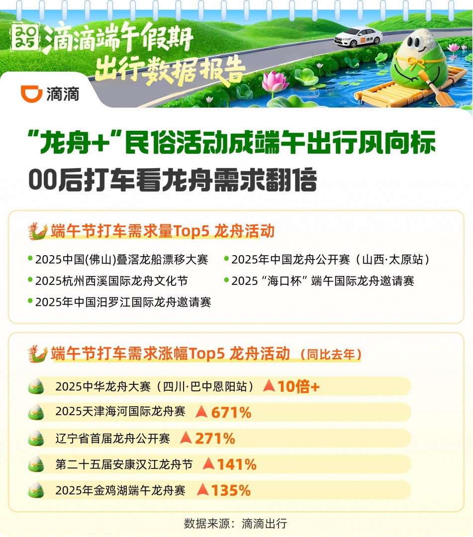 今年各地龙舟赛吸引年轻人的追捧,00 后打车看龙舟赛的需求同比上涨超 100%,在各年龄段中涨幅最高。