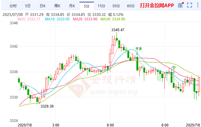 今日周二 (7 月 8 日) 亚盘时段,国际黄金目前交投于 3345.47 美元附近,截至发稿,国际黄金暂报 3333.69 美元/盎司,下跌 0.07%,最高触及 3345.47 美元/盎司,最低下探 3329.39 美元/盎司。目前来看,国际黄金短线偏向震荡走势。