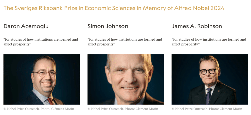 2024 年诺贝尔经济学奖获得者,(从左至右) 德龙·阿西莫格鲁、西蒙·约翰逊和詹姆斯·罗滨逊。诺贝尔奖官网显示,他们因 「对制度如何形成并影响经济繁荣的研究」 而被授予此奖项 (来源:nobelprize.org)