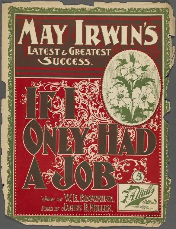 1898 年,一首美国流行歌曲 《如果我有一份工作》(If I only had a job) 的曲谱封面 (来源:digitalcollections.nypl.org)