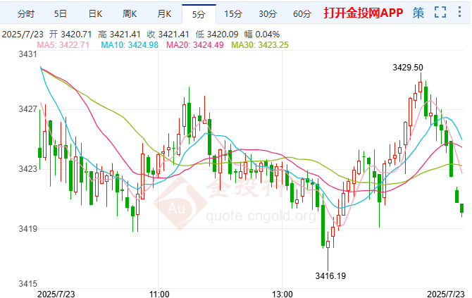 周三 (7 月 23 日) 欧盘时段,伦敦金价格震荡回落,美日贸易协议签订完毕,市场风险偏好回升,亚洲股市普遍上涨,打压黄金的避险需求,现货黄金一度回落至 3420 关口下方,美联储降息路径的不确定性,美欧贸易谈判未定,以及日本政局动荡,仍给金价走势提供支撑。