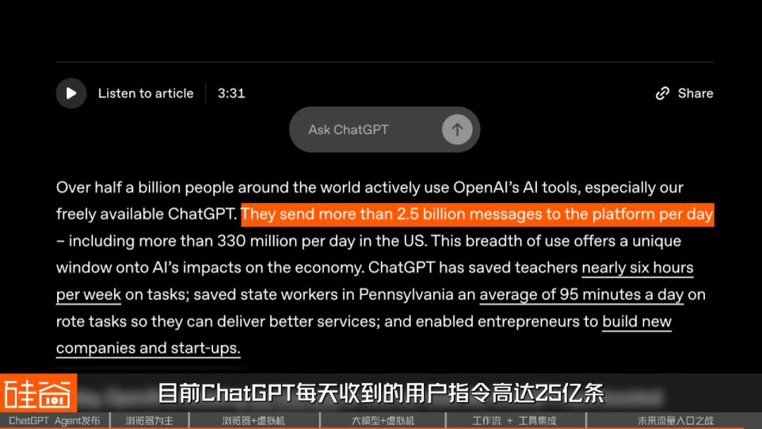 而就在 ChatGPT Agent 发布的同一天,OpenAI 公布了一个数据:目前 ChatGPT 每天收到的用户指令高达 25 亿条。