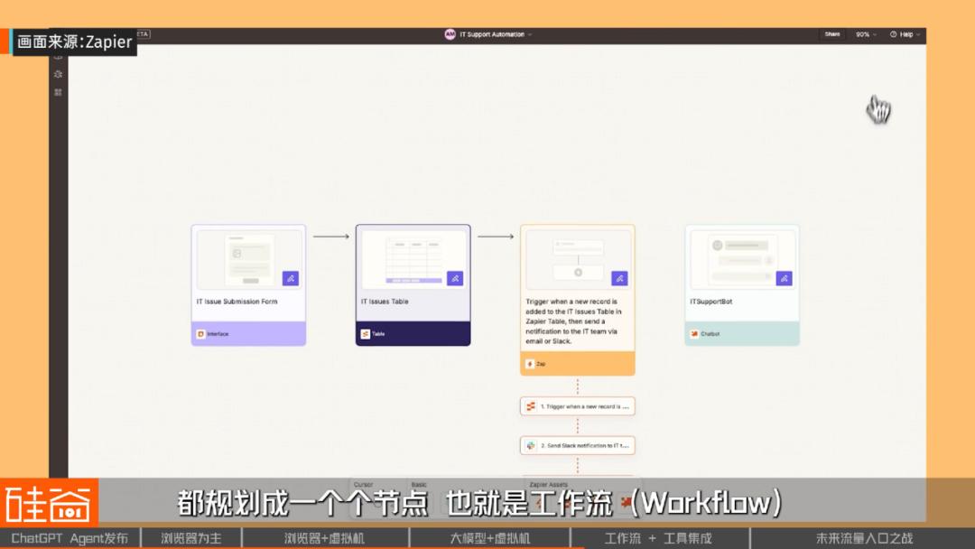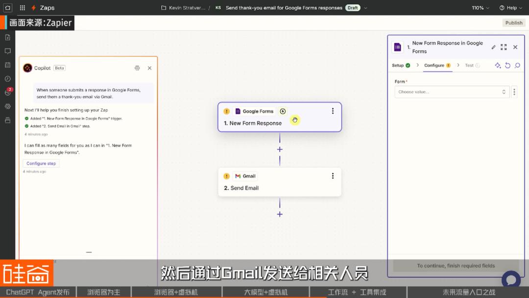 举个例子,Zapier(自动化工作流平台) 平台上用户可以设置一个自动化流程:一旦收到新的表单,就让 AI 读取内容整理摘要,通过 Gmail 发送给相关人员。