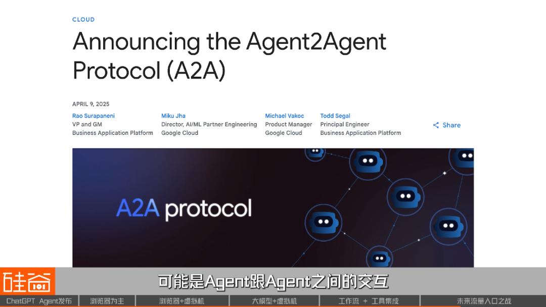无法避免的是,我认为在接下来一到两年,大多数门户网站的流量都将快速下降,无论是电子商务、搜索引擎、视频网站还是其他各类门户网站,它们的流量入口都将变成各个方向的 Agent。这正是 Google 推出 Agent2Agent (A2A) 协议的原因。每家公司都可能拥有自己的 Agent,实现 Agent 之间的交互。如果 Google 能够占据这个协议,并在 Gemini 中率先部署,它就将成为最大的赢家,因为它成为了 Agent 入口。ChatGPT 和 Claude 也是一样,它们推出协议的核心目的也是要占据智能体入口的战略地位。