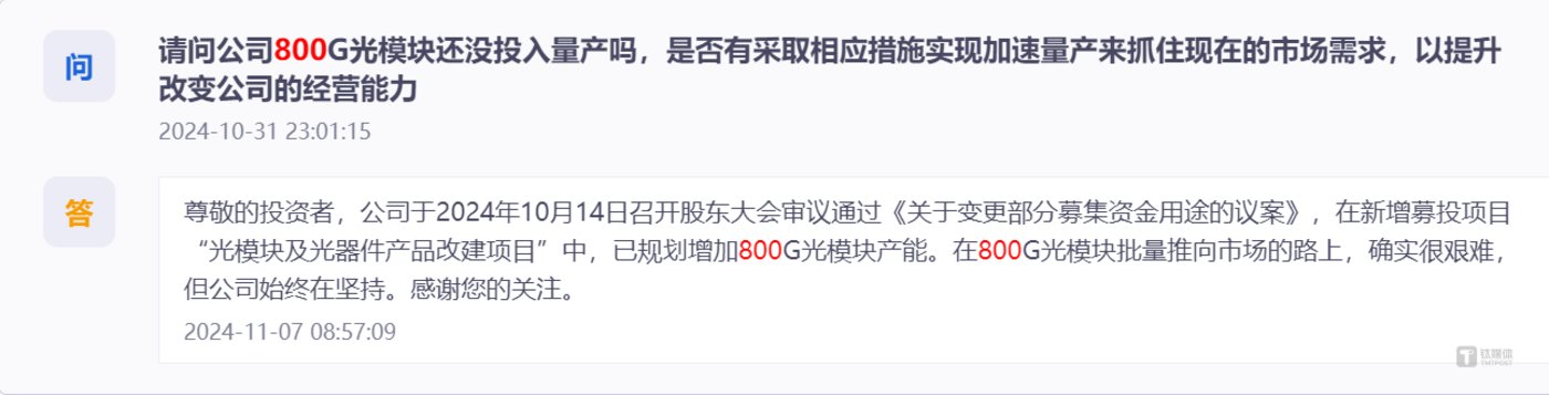 不过,光模块赛道巨头环伺 (中际旭创、新易盛等),技术迭代快,量产爬坡难度极大。对于投资者急切询问 800G 光模块量产进展,铭普光磁的回应略显无奈:「在 800G 光模块批量推向市场的路上,确实很艰难,但公司始终在坚持。」
