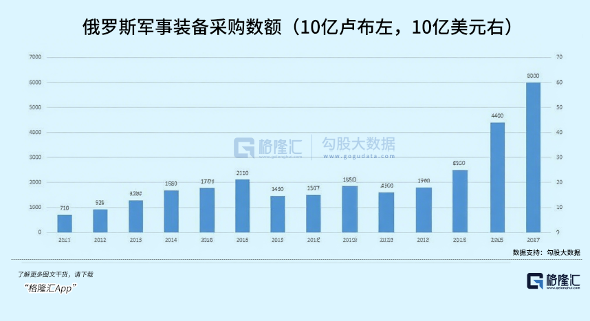 2021—2025 年,俄罗斯对外采购军事装备数额,从 1800 亿卢布飙升至 4400 亿卢布,涨幅超过 140%。预计到 2027 年,若战争仍未结束,将增长至 6000 亿卢布。