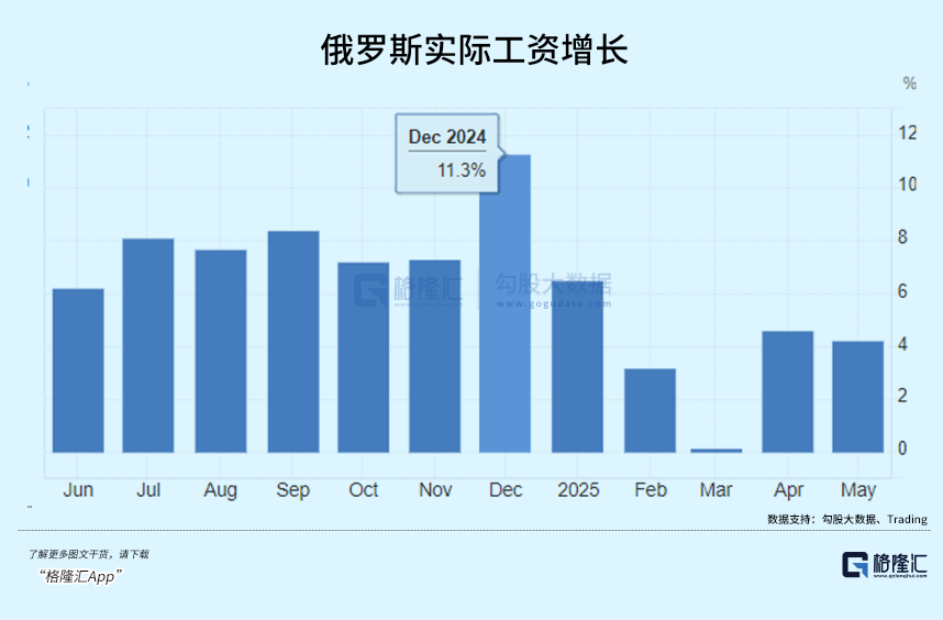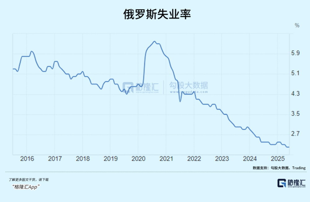 然而,在这样的底色下,俄罗斯的就业数据却非常 「良好」。2025 年 6 月,俄罗斯失业率与上个月持平,保持在历史最低水平 2.2%,低于市场预期。