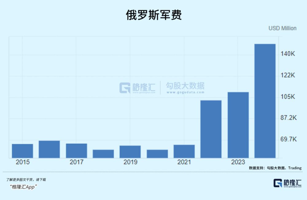 2024 年,俄罗斯直接国防开支飙升至 10.8 万亿卢布,相比 2021 年翻了三番;除此之外,4.1 万亿卢布的经济部门支出中,也有 3.05 万亿被列为军事工业补贴支出。