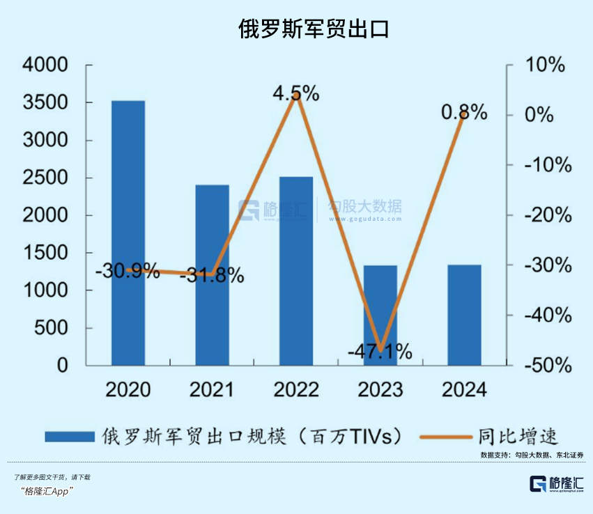 从 2023 年开始,俄罗斯的武器出口总额,就从过去多年 140—150 亿美元的稳定水平,骤然下降至 10 亿美元以下。
