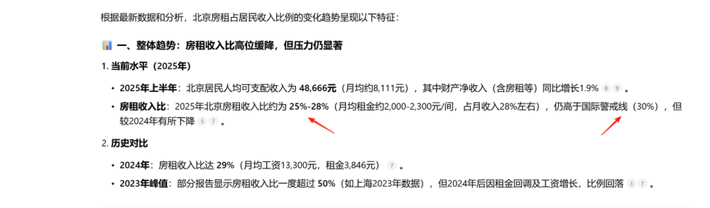 上图是 deepseek 所统计的北京的房租收入比情况,结论是:房租收入比高位缓降,但压力十分显著。