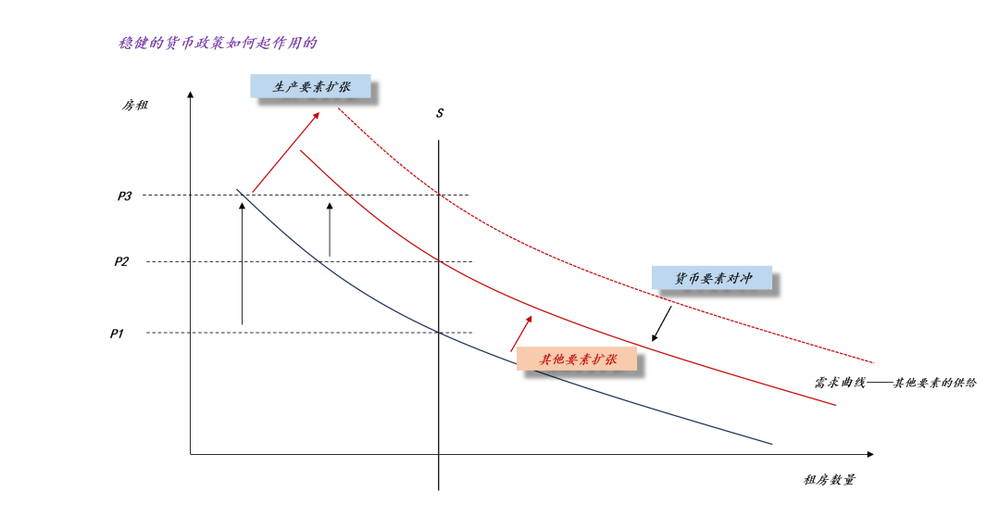 如上图所示,我们的潜在增速很高,于是,生产要素的扩张会把需求曲线推高到外围的虚线那里,导致房租攀升至 P3;但是,稳健的货币政策进行了对冲,把需求曲线反推至现实的位置,使得现实中的房租只提高到 P2。