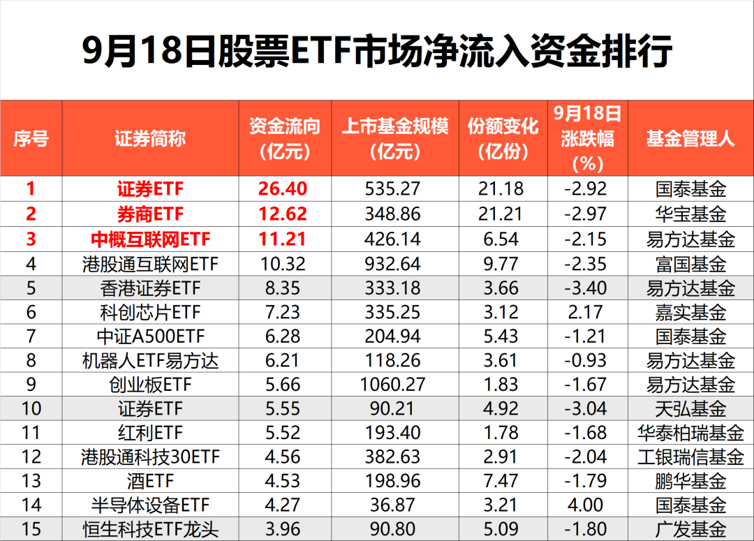 Wind 数据显示,截至 9 月 18 日,全市场 1209 只股票 ETF(含跨境 ETF) 总规模达 4.39 万亿元。在昨日股市调整行情中,股票 ETF 市场总份额增加 110.62 亿份。按照区间成交均价测算,昨日净流入资金为 108.19 亿元。