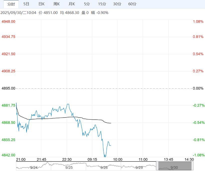 9 月 30 日早盘,PVC 主力合约弱势下行,目前盘内报 4851 元,跌幅-0.90%。成本端电石回落,烧碱止跌。整体而言,国内供强需弱的现实下,出口预期转弱,国内需求平淡,难以扭转供给过剩的格局,基本面较差,短期估值下滑至低位,下方空间短期有限,中期关注逢高空配的机会。