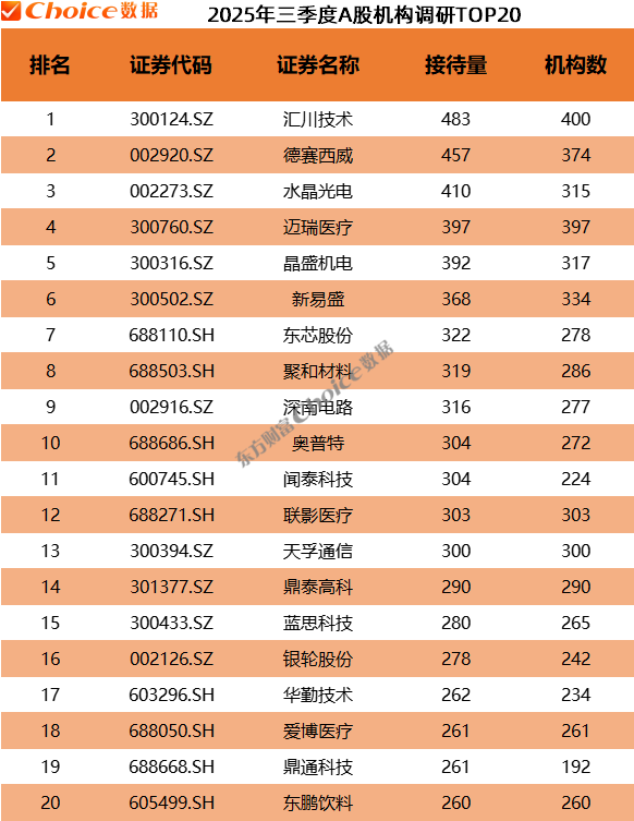 三季度,汇川技术荣登机构 「调研冠军」 宝座,机构调研总量 483 次,共 400 家机构参与调研;德赛西威、水晶光电、迈瑞医疗、新易盛等获机构调研总量超过 300 次。