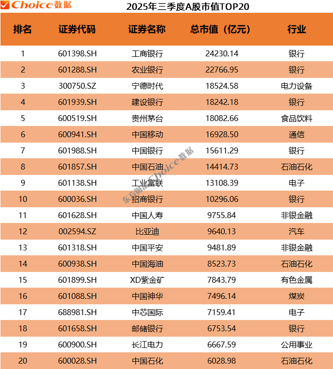 截至三季度末,A 股市场共 10 只个股总市值超万亿元,工商银行市值 2.42 万亿元,为 A 股市值最大公司;农业银行以 2.28 万亿元排名第二;宁德时代、建设银行、贵州茅台市值均超 1.8 万亿元。