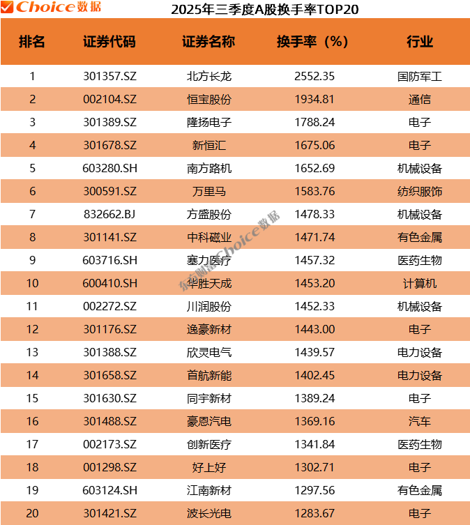 三季度,北方长龙换手率排名第一,高达 2552.35%。