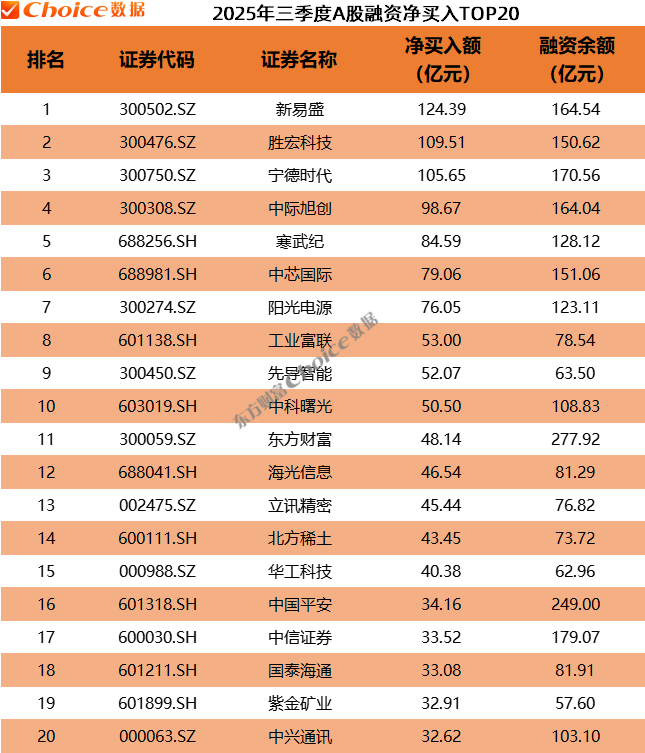 截至 9 月 29 日,三季度共 105 只个股获融资资金净买入超 10 亿元,新易盛以 124.39 亿元的净买入额排名榜首,胜宏科技、宁德时代排名第二、第三,分别净买入 109.51 亿元、105.65 亿元。