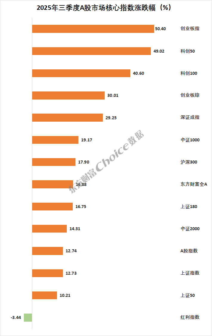 9 月 30 日,A 股 2025 年三季度行情正式闭幕,上证指数报收 3882.78 点,上涨 12.73%;深证成指报收 13526.51 点,上涨 29.25%;创业板指报收 3238.16 点,上涨 50.4%。