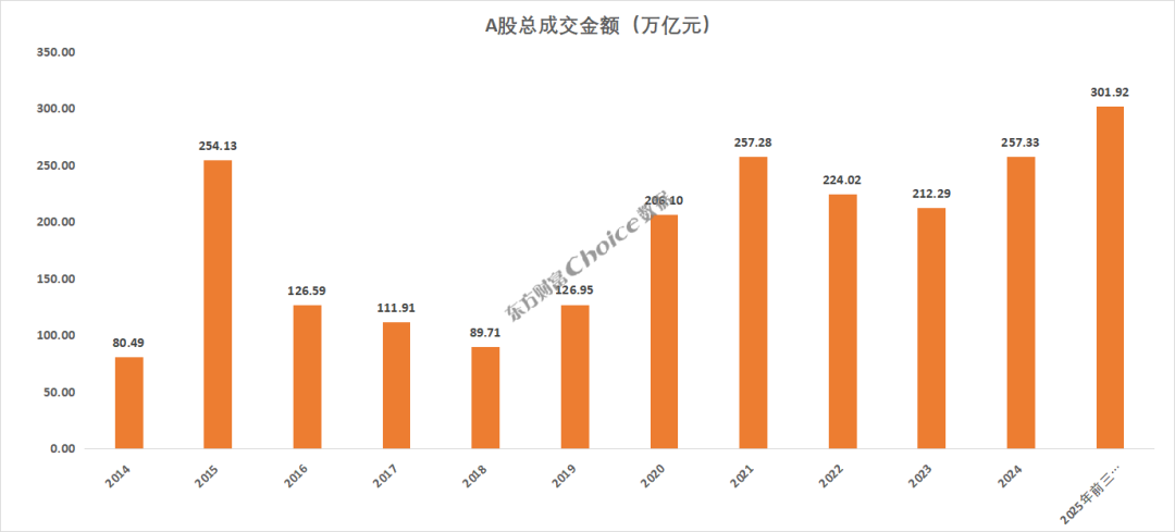 2025 年三季度 A 股总成交金额 139.24 万亿元,前三季度共 301.92 万亿元,超过 2021 年全年成交金额 257.28 万亿元,刷新 A 股新纪录。