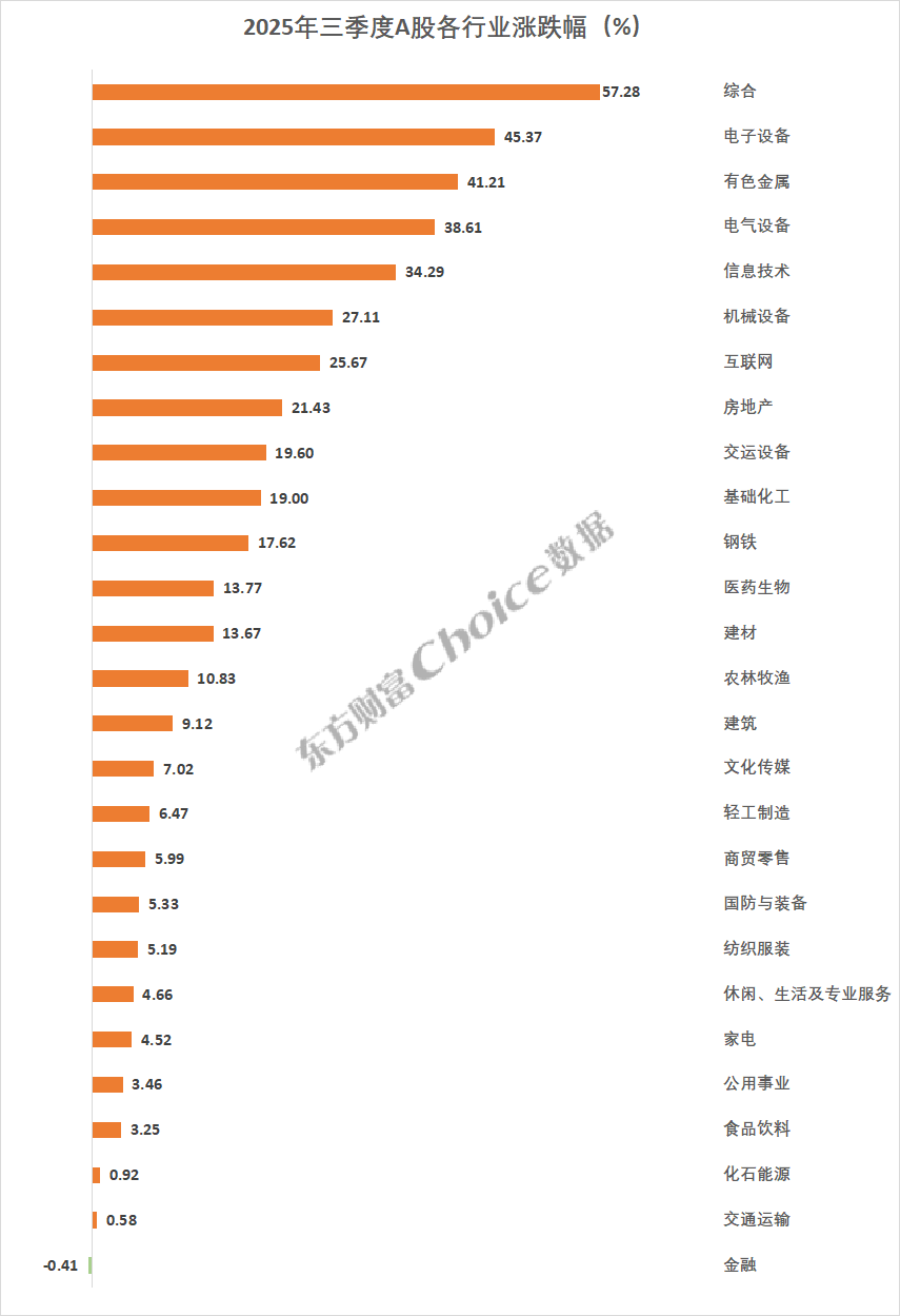 三季度,东财一级行业指数普涨,综合行业以 57.28% 的涨幅排名第一;电子设备、有色金属分别上涨 45.37%、41.21%,排名第二、第三;电气设备、信息技术涨幅超过 30%;房地产上涨 21.43%。仅金融行业下跌 0.41%。