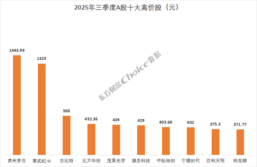 截至三季度末,贵州茅台股价 1443.99 元,仍是 A 股市场股价最高个股,寒武纪-U 排名次席,股价高达 1325 元。