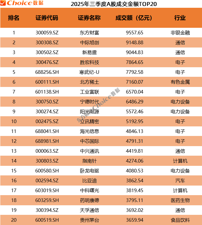 三季度,A 股成交金额最大的个股是东方财富,累计成交 9557.65 亿元,中际旭创位居次席,成交 9148.88 亿元,新易盛、胜宏股份、寒武纪-U等成交金额超 7000 亿元。