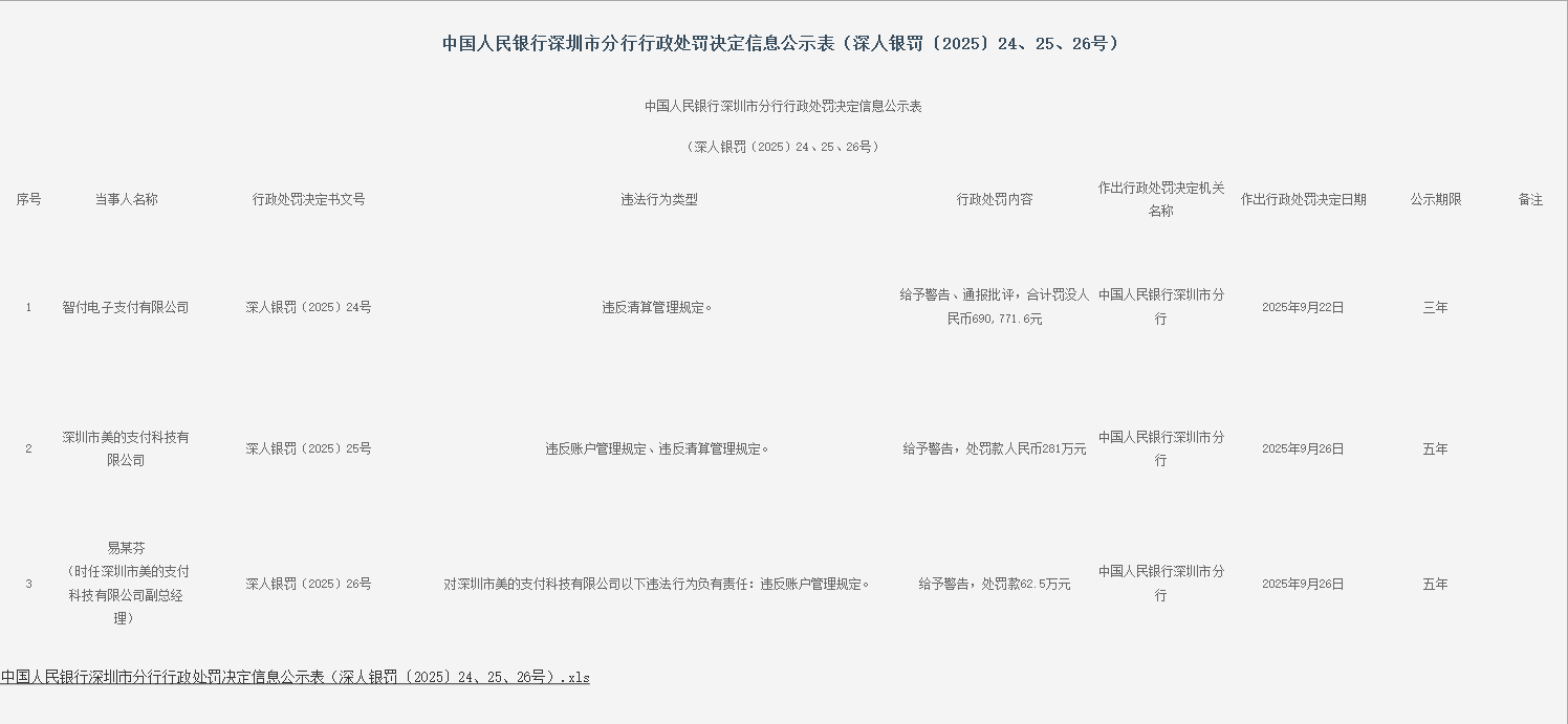 财联社 9 月 30 日讯 (记者 梁柯志)国庆长假前夕,人行深圳市分行 (简称深圳人行) 在今日公示一则行政处罚信息 (深人银罚 〔2025〕24 号、25 号、26 号),涉及两家支付机构,其中深圳市美的支付科技有限公司因违反账户管理规定、违反清算管理规定被重罚 281 万元,责任人连带被处罚 62.5 万元。