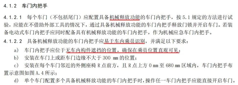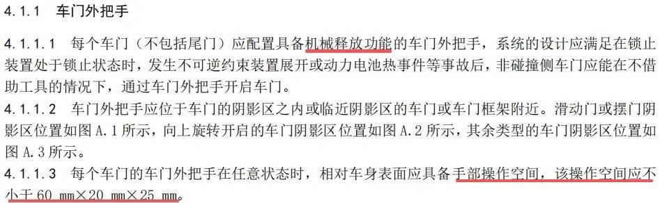 简单来说,这回新国标的重点无非就这么几条,首先,新规明文规定了车门外把手应该具备机械释放功能,电子开启的全军覆没。