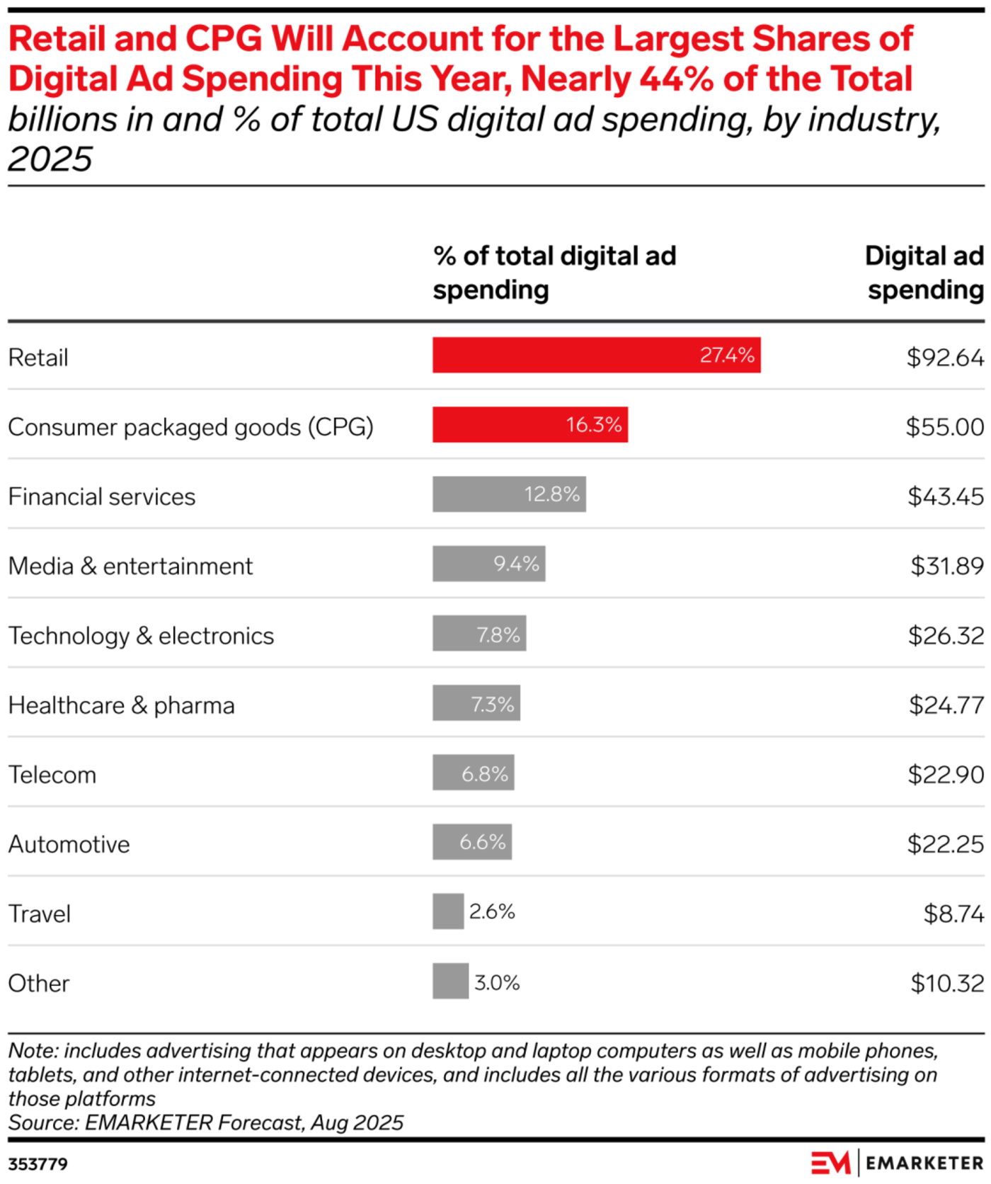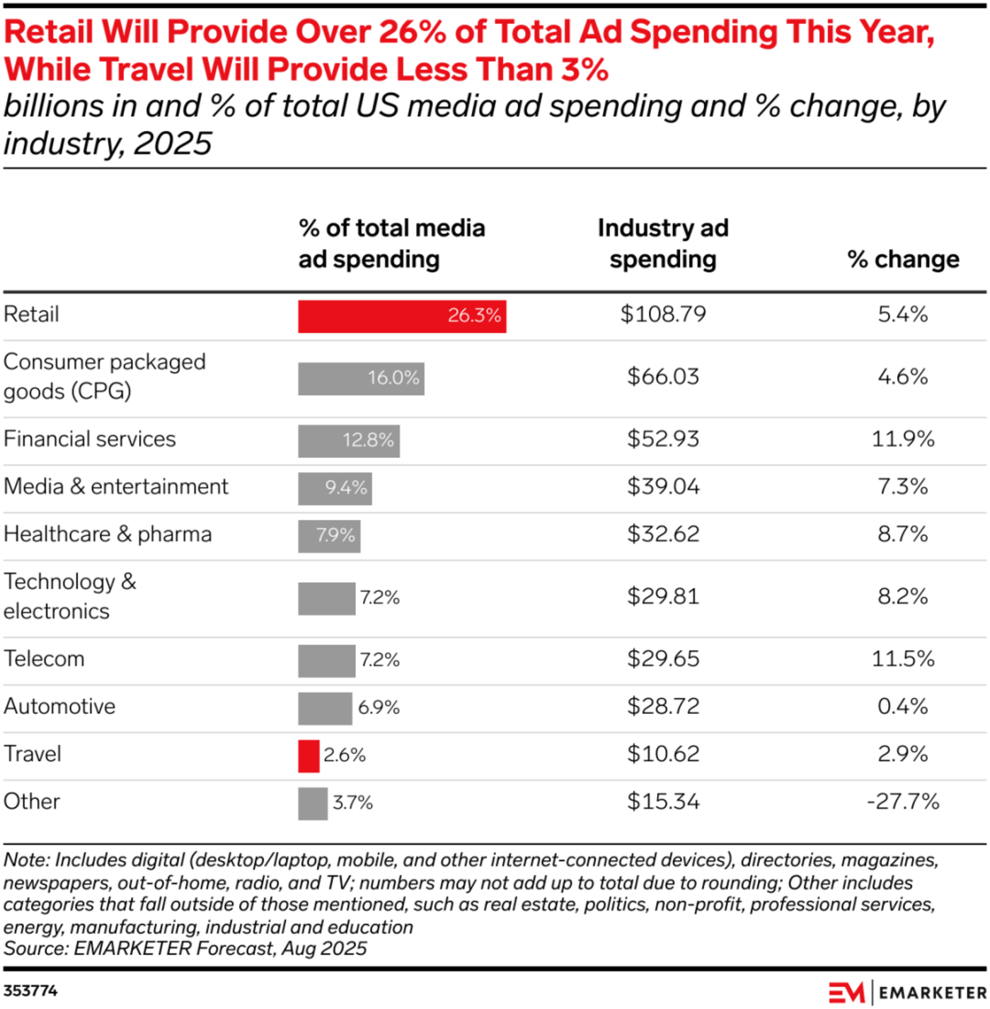 2025 年,美国零售行业的广告支出增速已经落在全国平均线之后。