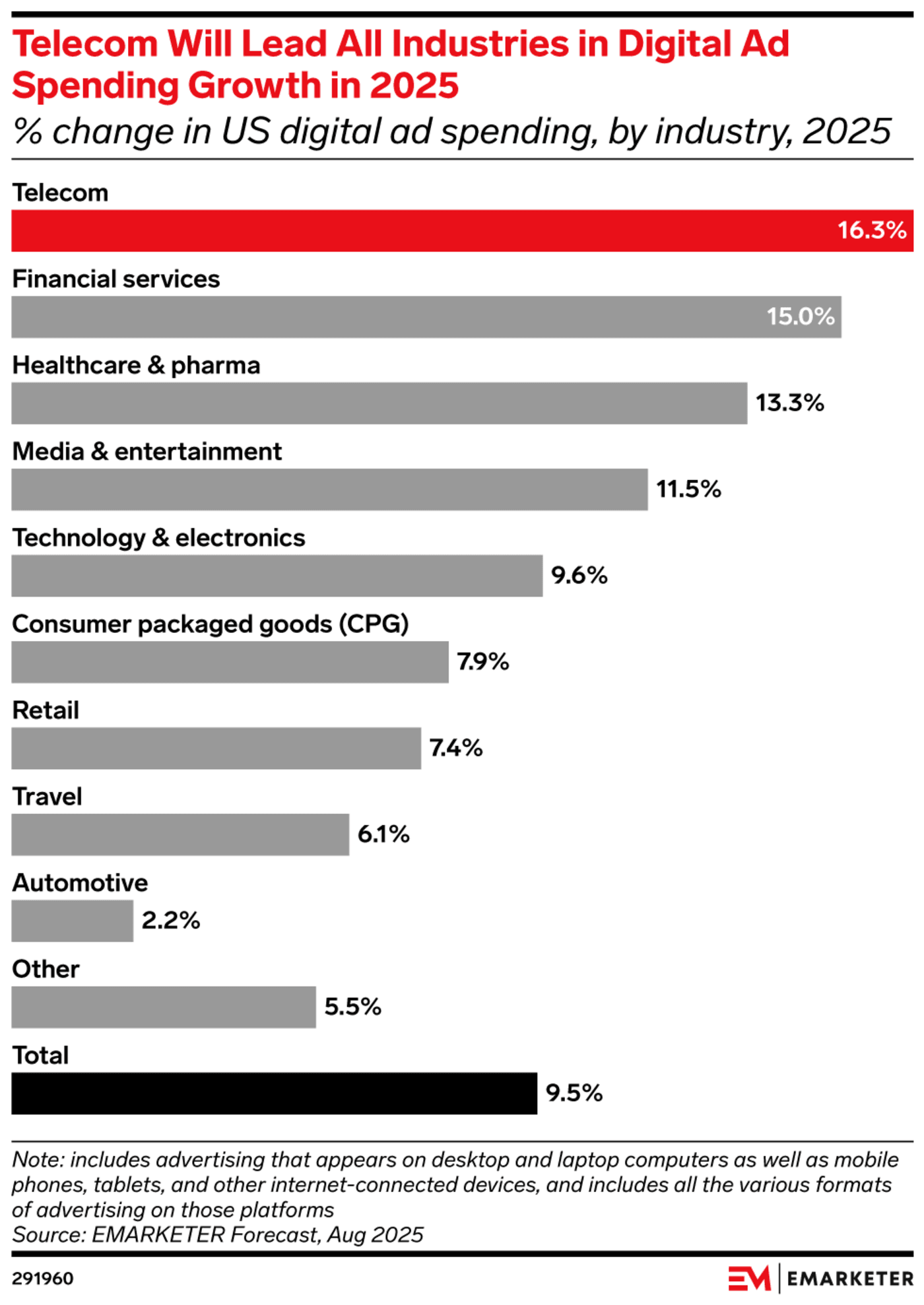 在美国,电信行业从来不是传统意义上的广告大金主。但我注意到,在 2025 年的美国广告市场,它却成了增长率最高的行业。