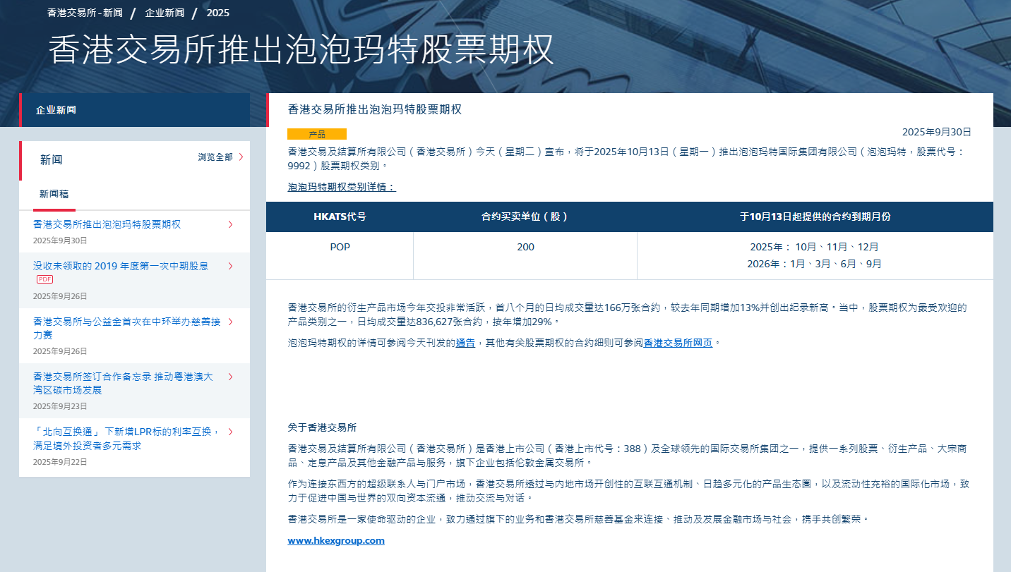 财联社9月30日讯,香港交易所宣布,将于2025年10月13日(星期一)推出泡泡玛特国际集团有限公司(泡泡玛特,股票代号:9992)股票期权类别。