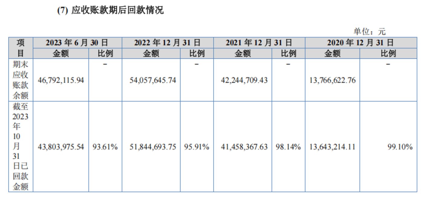 招股书显示,2020 年、2021 年、2022 年及 2023 年上半年,芭薇股份应收账款期后回款率分别为 99.1%、98.14%、95.91% 及 93.61%,呈现连年下跌之势。