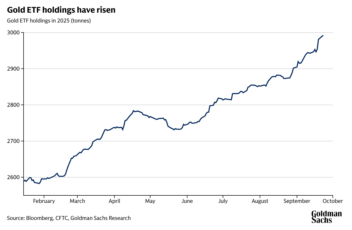 根据高盛 9 月 30 日发布在官网的文章,该行研究部重申金价到 2026 年中期将达到每盎司 4000 美元的预测。这一预测的支撑来自核心买家群体的新增需求——正是这些买家推动黄金价格屡创历史新高。2025 年以来,黄金价格已上涨近 48%,有望连续第三年录得两位数涨幅。