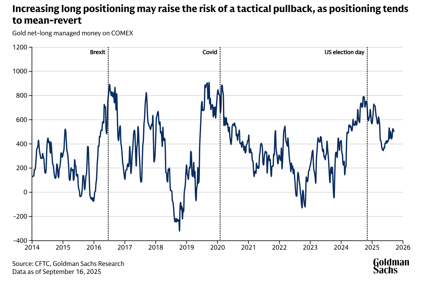高盛研究部认为,金价超预期上涨的风险,要大于低于预期的风险。不过托马斯也指出,看多仓位的增加 (即押注金价上涨的头寸增多)「可能引发短期回调风险」,因为从长期来看,投机者的黄金净持仓往往会向均值回归。