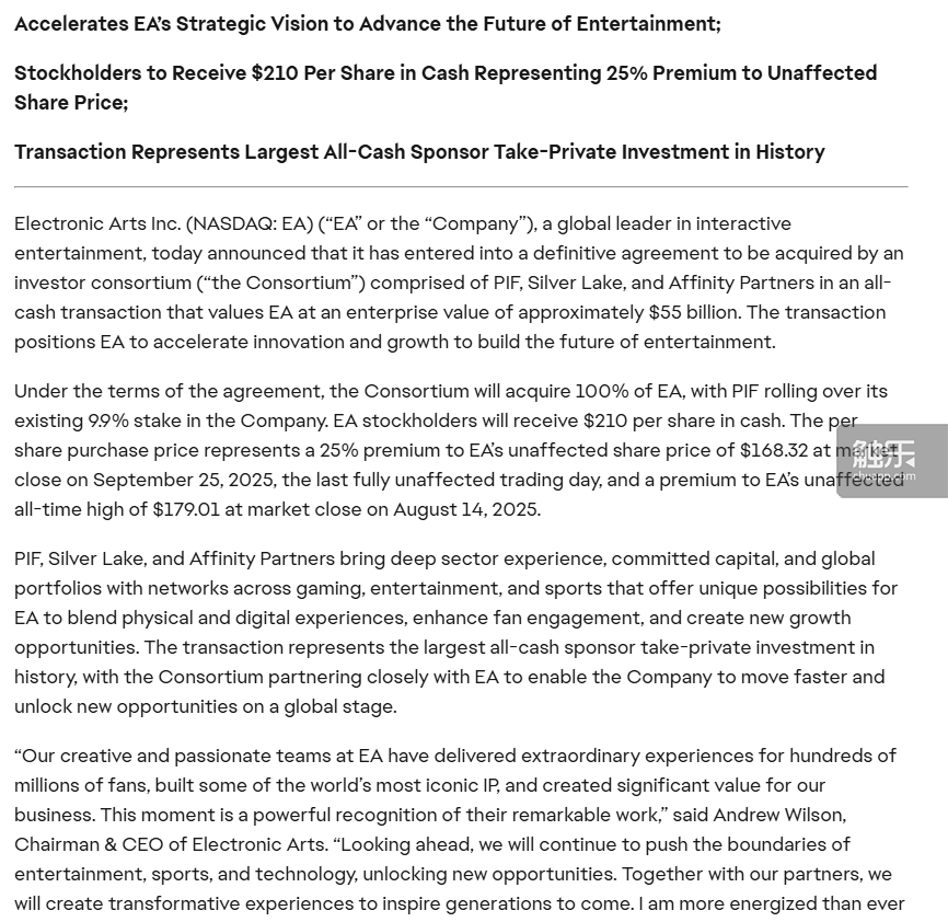 EA 预计,这起交易将于下一财年第一季度 (2026 年 6 月 30 日前)完成,收购完成后,EA 将退市。公司同时表示,交易完成后,EA 总部及公司领导层保持不变,并继续由安德鲁·威尔逊担任首席执行官。