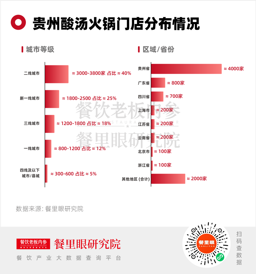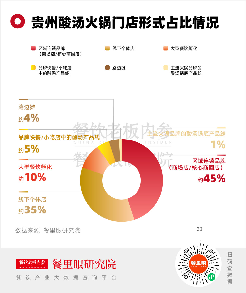 贵州酸汤风味在网络平台迅速传播至全国市场,各地陆续出现贵州酸汤火锅个体店或区域小连锁品牌。这类独立个体餐厅占比大约 35%,门店市场分散度高,但更强调正宗贵州酸汤口味。