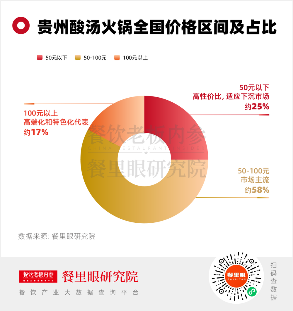 根据餐里眼数据显示,全国贵州酸汤火锅的价格带从 30 元到 100 元以上价位不等,综合来看,消费者在全国大多数连锁贵州酸汤火锅店用餐,人均花费大约在 80 元上下。