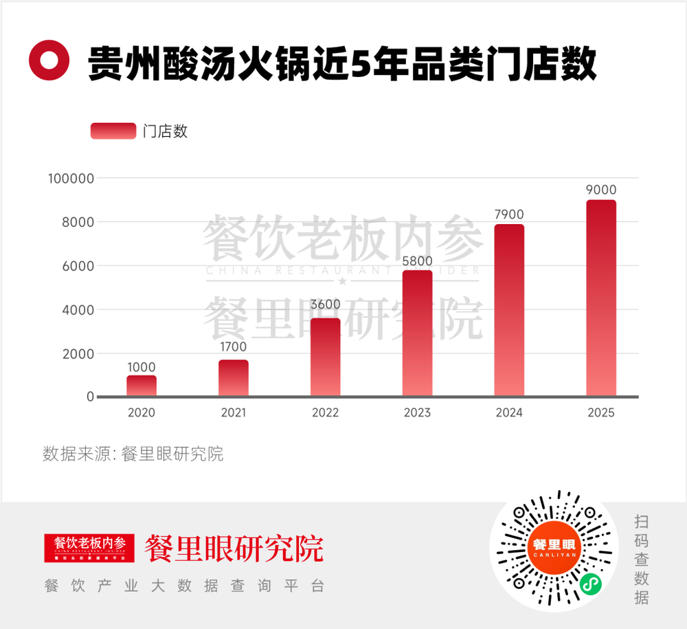 不过,尽管热度高涨、增长迅猛,但贵州酸汤火锅品类在餐饮市场中仍体量较小。据餐里眼数据统计,目前其品类门店总数为 9000 家左右。门店增长情况自 2022 年起大幅增长,2023 年~2024 年间增长持续高涨并达到顶峰,进入 2025 年增长开始放缓。