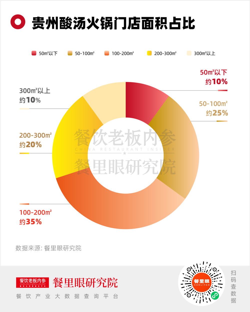 从火锅品类属性看,贵州酸汤火锅门店经营面积集中在中大型门店,50㎡~300㎡占比约 80%。