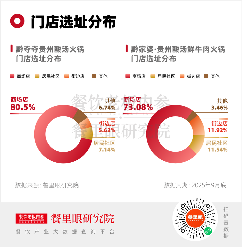 有近 260 家的黔家婆·贵州酸汤鲜牛肉火锅,商场店占比达到 73.08%,超 100 家店的黔夺夺贵州酸汤火锅,商场店选址占比达到约 80.5%,王奋斗贵州酸汤牛肉火锅商场店占比近乎 80.7%。