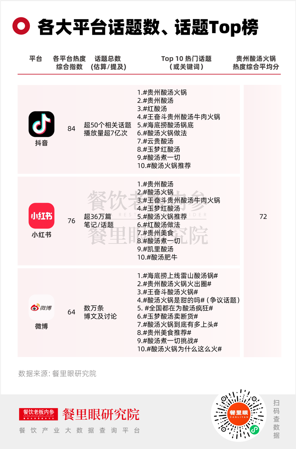 这种天生的上镜体质,让贵州酸汤火锅广受年轻消费者喜爱,相关话题在抖音平台总播放量超 7 亿次;在小红书平台则有超过 36 万篇相关笔记。