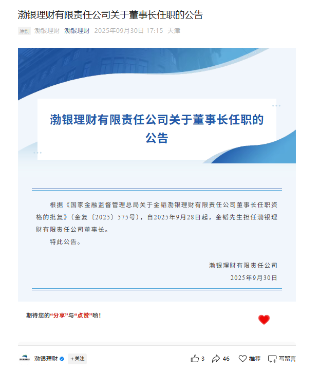 财联社 9 月 30 日讯 (记者 郭子硕)渤银理财正式迎来新任 「掌门人」。