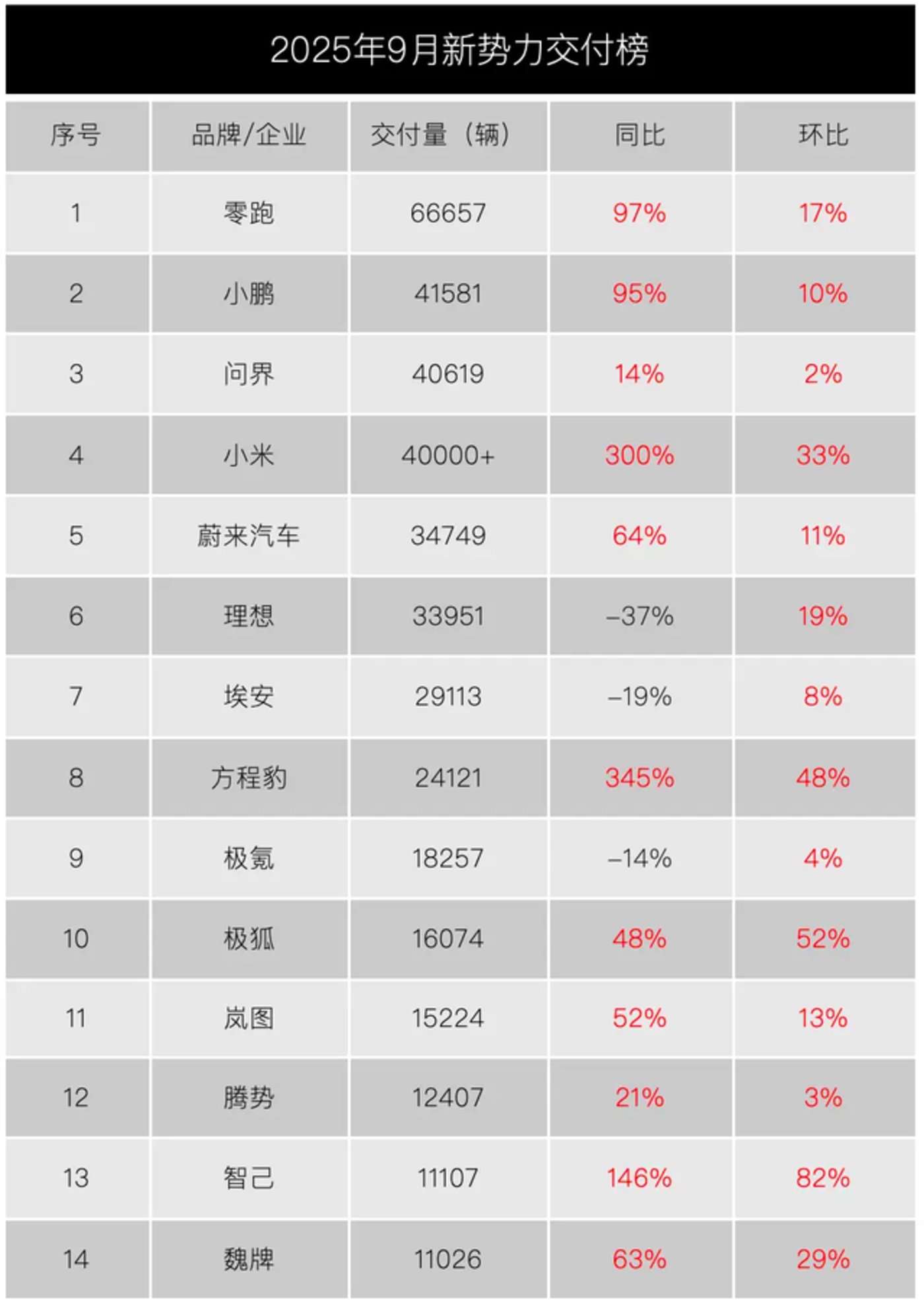 排名第一的零跑 9 月交出了一份不错的答卷:交付 66657 台,同比翻了近一倍,成为第一个月销破 6 万的新势力品牌。