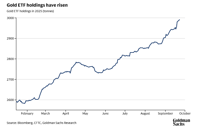 高盛研究部分析师 Daan Struyven、Lina Thomas、Alexandra Paulus 在最新发布的报告中表示,流入黄金 ETF 的资金意外强劲,超过了此前模型预测的水平。私人投资者大力投资黄金的可能性,给他们的预测带来了 「巨大的上行风险」,即 2026 年中 4000 美元/盎司和明年年底 4300 美元/盎司。