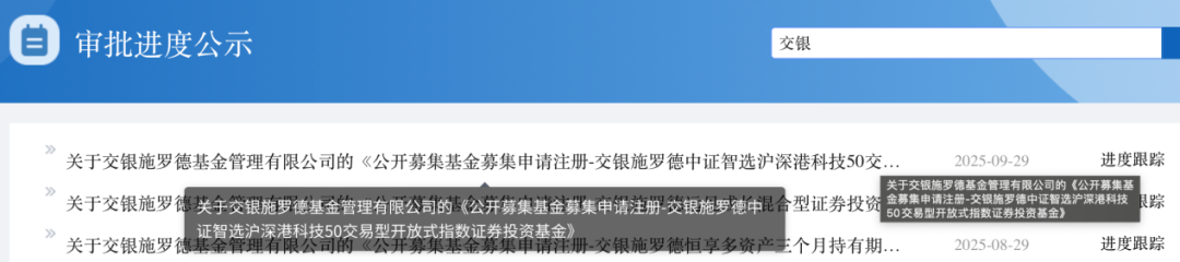 证监会网站信息显示,9 月 29 日,交银施罗德基金上报了一只名为 「交银施罗德中证智选沪深港科技 50ETF」 的基金,目前处于接收材料的状态。