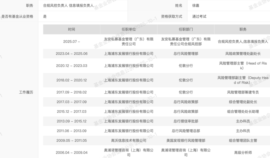 友安私募基金的合规风控负责人徐嘉,早年在奥浦诺管理咨询、高沃信息技术工作;2011 年 6 月加入浦发银行,曾任职总行风险管理部门,在浦发银行工作长达 14 年时间;2025 年 6 月离开银行,开启创业道路。