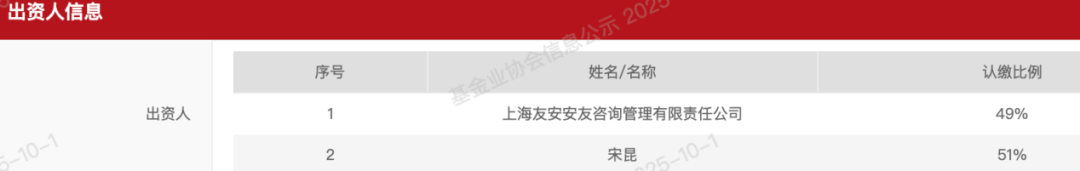 从出资人来看,原知名基金经理宋昆为友安私募基金的实际控制人,认缴比例为 51%;上海友安安友咨询管理有限责任公司认缴比例为 49%。