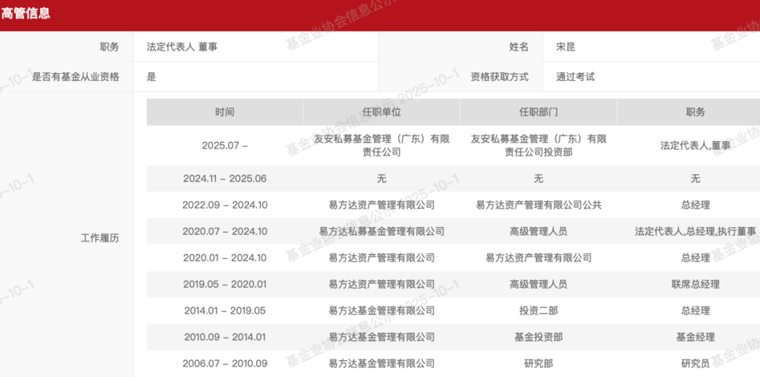 2019 年 1 月宋昆卸任所有在管基金,2019 年 5 月他加入易方达资产,担任联席总经理;2020 年 7 月他还担任易方达私募基金的法定代表人、总经理、执行董事,直到 2024 年 10 月离开。此后宋昆休息了一阵子,2025 年 7 月创立了友安私募基金,担任法人、董事。