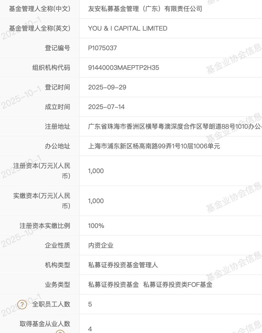 协会网站信息显示,友安私募基金成立于 2025 年 7 月 14 日,并于 2025 年 9 月 29 日完成私募证券投资基金管理人登记。该公司注册资本为 1000 万元,注册地在广东省珠海市香洲区,办公地在上海市浦东新区,目前有 5 名全职员工。